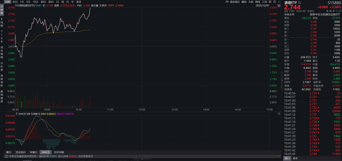 今年以来通信ETF(515880)在A股表现优异,在AI发展叙事的助力下,截至写稿年内涨幅超100%,居全市场ETF涨幅第一。