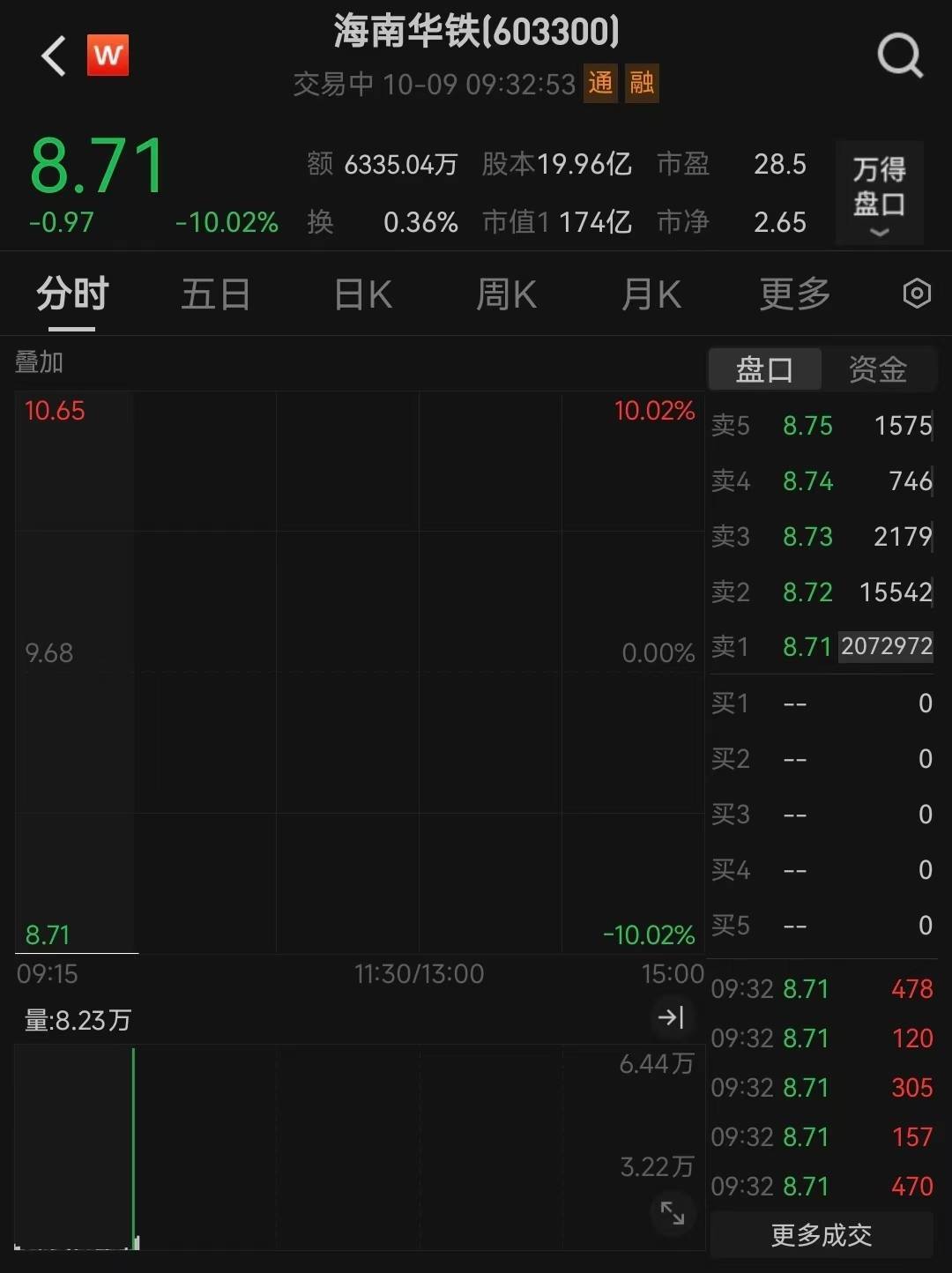 【大河财立方消息】10月9日,海南华铁开盘一字跌停,现报8.71元/股。